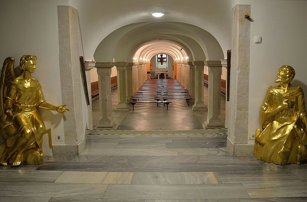 The layout of the lower church is in the shape of an inverted letter T and was completed by 1693. One is immediately struck by the numerous supports and massive pillars that divide the interior into naves of the stark, low room. On both sides of the long corridor running under the nave and leading from the street to the lower church there are crypts with the tombs of, among others, the Marshal of the Great Sejm Stanisław Małachowski , Prince Adam Kazimierz Czartoryski (his marble tombstone is in the Chapel of Our Lady in the upper church) and the missionary and charity activist Father Gabriel Baudoin , called the great almoner of Warsaw. In the catacombs further on in the lower church, the following are buried: Sisters of Mercy and missionary priests, among them the first visitor of the missionary congregation, Bishop of Poznań Michał Bartłomiej Tarło , high-ranking state officials from the times of the Great Sejm , the Duchy of Warsaw and the Kingdom of Poland : the Voivode of Podlasie Stanisław Bernard Gozdzki, the Voivode of Pomerania Jerzy Detloff Flemming , the Voivode of Ruthenia and the Starost of Warsaw August Aleksander Czartoryski , the Starost of Warsaw and Minister of State in the Kingdom of Poland Walenty Faustyn Sobolewski , Minister Tadeusz Dembowski , the charity activist Jan Tadeusz Lubomirski , the economic activist Andrzej Artur Zamoyski , Maria Anna de la Grange d’Arquien Wielopolska, sister of Queen Maria Casimire and wife of Chancellor Jan Wielopolski, and Princess Maria Radziwiłłowa, a philanthropist.