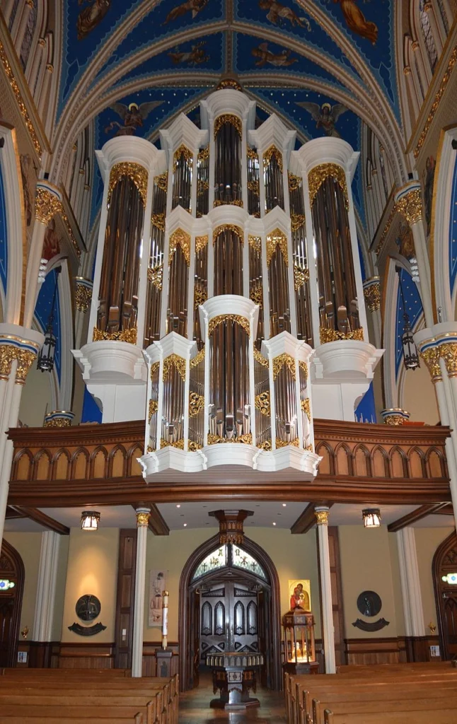The first Sacred Heart Church had a small reed organ in the 1850s. Father Edward Sorin approved its replacement in 1865 with a 1,500-pipe hand-pumped organ. Derrick and Felgemeker of Erie installed a 2,000-pipe organ in the newly constructed but unfinished Sacred Heart Church in 1875. This organ was later moved inside the completed church. In 1961 university president Rev. M. Theodore The addition of 300 pipes to the organ was approved by Hesburgh. On 2 April 1978 a new organ was installed, donated by Marjorie O’Malley and built by the Holtkamp Organ Company of Cleveland, Ohio. It debuted at a dedication Mass celebrated by Hesburgh and a recital performed by Professor Michael Schneider of Cologne, Germany. In the fall of 1981, Professor Craig Cramer joined the Department of Music at Notre Dame and took over Calvin Bower’s task of creating the organ performance program. At the end of 2006, Dr. formed a committee led by Campus Ministry to look into replacing the basilica organ. Gail Walton, the basilica’s director of music since 1988. After conducting a nationwide search, the committee decided to give Paul Fritts the commission to build the new organ for Saint Joseph Cathedral in Columbus, Ohio, in December 2006. This was Fritts’ second commission from Notre Dame. In 2004, Paul Fritts and Company Organ Builders of Tacoma, Washington, completed a 35-stop organ that was also an O’Malley gift and was designed in the northern German tradition for the new DeBartolo Performing Arts Center’s Reyes Organ and Choral Hall. The Great Recession halted the project by taking a hit on the university endowment and benefactions, and the idea of replacing the basilica organ was tabled indefinitely. The project was further dealt a blow by the death of its foremost champion Gail Walton in February 2010. However, the university approved a plan to commission a new organ for the basilica in the fall of 2010 and began the search for a donor. As decided previously, organ maker Paul Fritts was commissioned for the project, and initial design work began in 2012 with work on the case in Tacoma beginning in 2013. The project called for a four-manual instrument with 70 stops, 5,164 pipes, and a case that was based on Dutch masterpieces. It was to be Fritts’s greatest creation. The basilica closed in Christmas 2013 for the first phase of the organ project, which included a 44-day replacement of the church carpeting with 25,000 slate-colored porcelain tiles to improve acoustics. Meanwhile, a third Fritts commission, sponsored by Denis ’67 and Susan McCusker, saw a studio organ designed in 2014 for the Walton Choir Rehearsal Hall in Coleman-Morse Center. On 28 December 2015 the Holtkamp organs played its last song, Silent Night, before its dismantling started the next morning. The organ pipes were donated to the reconstruction of a local parish, Saint Pius X in Granger, Indiana. In October 2015, Fritts loaned the church a temporary organ once the Holtkamp was removed. The concrete of the choir loft was reinforced, and steel support structures for the foundation were added. The basilica choirs sang in the west transept next to the interim organ during the installation of the new organ. On Sunday, July 31, 2016, the brand-new organ, which bears the names of the donors Wayne and Diana Murdy, arrived at the basilica on two tractor-trailers. By end of August 2016, the façade and case was completed, and Fritts Company began the process of tuning and voicing the pipes and connecting the organ’s key action, stop action, windworks and electrical wiring. On October 6, the organ was put through its first full performance test during the annual Blue Mass to honor police, firefighters, and emergency medical personnel. In the weeks that followed, the last rank of pipes were tuned. It was finished on schedule for Christmas 2016. The new four-manual 70-stop Murdy Family Organ was designed and built by Paul Fritts & Company Organ Builders as its Opus 37. It has 4 keyboards, 70 stops and 5,164 pipes and stands 40 feet high and weighs more than 20 tons. Workers were required to reinforce the loft in order to support the larger instrument prior to installation. Bishop Daniel Jenky returned to campus to dedicate the instrument on 20 January 2017 which featured a recital by university professor and organist Craig Cramer.