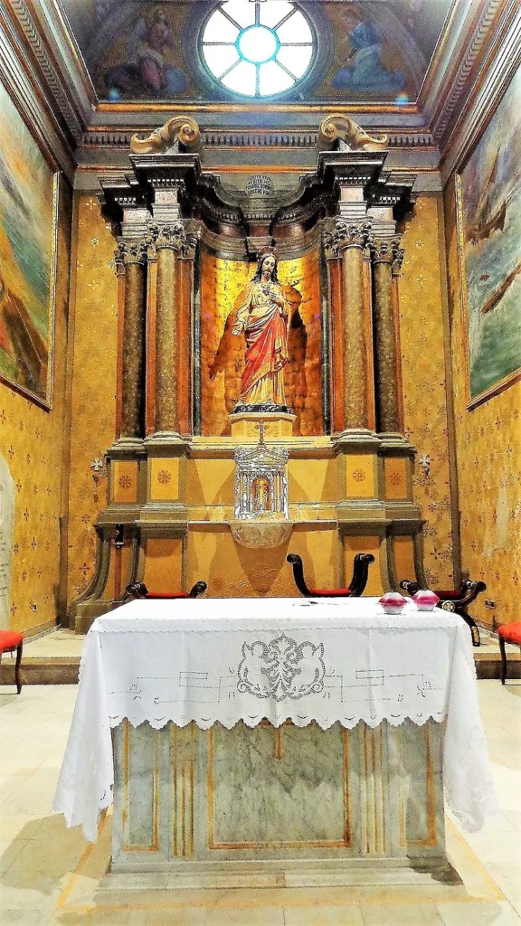 The High Altar of the sanctuary is dedicated to the Sacred Heart of Jesus, and its design features a double pair of columns, with the inner columns projecting and topped by symmetrical, curled tympanums. At the center, a coat of arms is flanked by friezes and bears the inscription “VENITE FILII, AVDITE ME, TIMORE DOMINI, DOCEBO VOS”, which translates to “Come, children, listen to me; I will teach you the fear of the Lord.” While the altar initially hosted the Madonna’s icon, it now houses the statue of the Sacred Heart of Jesus, with a richly adorned silver tabernacle at its center. The sanctuary’s altar features one of the last rites performed ad orientem, before the construction of the modern altar versus populum (altar facing the people). The presbytery contains two large paintings, one depicting the veneration of the icon, and another showing the recovery of the icon by fishermen’s nets after it was moved from the chest.