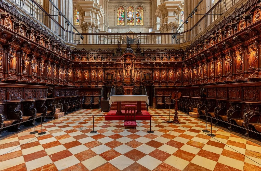 The choir is one of the cathedral’s most valuable spaces, a masterpiece of Baroque carpentry and one of the most dazzling works of the sculptor Pedro de Mena.  However, several artists worked on the choir. In 1633, the Málaga city council contracted Luis Ortiz de Vargas, who designed the wooden structure of the complex and created some of the sculptures.  Shortly afterward, José Micael Alfaro carved the apostles and some of the small busts of saints that adorn the choir stalls.  Work was interrupted by his death in 1649.  José Micael Alfaro imbued his sculptures with a stark dramatic quality, employing Mannerist techniques. In 1658, work resumed after the arrival of Pedro de Mena, who created forty-two high-relief figures attached to the backs of the choir stalls, in addition to the crowning of the choir.  The expressiveness of the hands, the mysticism of the figures, and the gestures of his sculptures are exceptional.Above the sides of the choir stand the horizontal trumpet organs , the work of Julián de la Orden between 1779 and 1781.  The cases were carved and designed by José Martín de Aldehuela, in harmonious composition with the rest of the church.  They have more than four thousand pipes.  The two organs are practically identical, except for the length of some of their pipes.  They also differ in sound.  Each organ has 3 keyboards and 64 stops.The choir screen is dominated by an altar where a beautiful Pietà, sculpted in marble by the Pissanis brothers, rests.  In the side niches are venerated the carvings of Saint John and Mary Magdalene, created, like the images in the side chapels, by the 19th-century sculptor from Málaga , Salvador Gutiérrez de León.