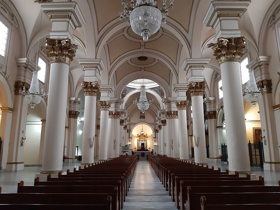 The Cathedral is made up of a classic basilica plan in the shape of a Latin cross that occupies an area of 5,300 square meters, has five naves: the central nave and two lateral ones of the same height and the other two for the chapels. It also has a main altar and 16 chapels: 8 in the south nave, 8 in the north nave and a frontal one in the central nave, which are complemented by the choir and two sacristies. The lantern and dome are located at the intersection of the transept with the crossing, supported by four pendentives and decorated in the shape of a half orange, with indigo blue and thirteen tongues of fire. The vaults of the naves and chapels feature florets in the center of the white interior painting. The façade is divided into two sections. The first is composed of eight Corinthian pilasters that rise to the architrave, frieze and cornice, also in the Doric order; the second section is in the Ionic order and is adorned with eight pilasters. Three sculptures made by Juan de Cabrera adorn the upper part of each door: the north door, Saint Peter; the south door, Saint Paul; and the frontispiece, the Immaculate Conception with two angels on either side crowning her; above the latter, the façade is finished with an isosceles triangle adorned with indented, Ionic moldings and above it a double-armed papal cross. Below the statue, above the lintel of the main door, a white marble slab bears the inscription: “Under the title and patronage of the Immaculate Conception of Our Lady, religious Santafé will prosper. Year MDCCCXIV. Capuchin architect Fray Domingo de Petrés The towers, rebuilt after the earthquake of 1827, are 52 meters high and start from the main cornice in the manner of a bell tower, each one is formed by three bodies with openings on the four sides in the upper body for the bells and in the middle body; the south tower is consecrated to Santa Bárbara , while the north tower, consecrated to San Emigdio has a clock. The main door, made in the 16th century, is 7.20 meters high by 3.60 meters wide, is adorned by two independent pilasters in the form of fluted columns of Ionic order, whose capitals end in the cornice of the front, and has knockers, bolts, studs and fittings in Spanish cast bronze and five salamanders in solvier. The side doors measure 5.60 meters high by 2.80 meters wide. The atrium measures 110 meters in length and was built between 1631 and 1664. It was paved in 1842 and extended to the southern end of the square, and in 1913, the angle of the corner was rounded to make it easier for the tram to turn along Seventh Street. In 1815, it was extended to the Chapel of the Tabernacle. In 1842, it was paved.